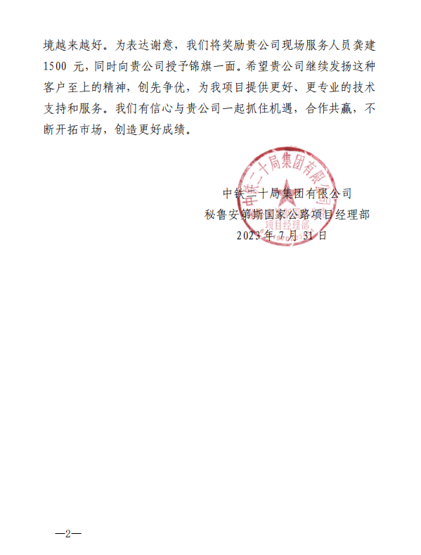 Here, we sincerely thank your company for the Peruvian highway project of China Railway 20 Bureau.